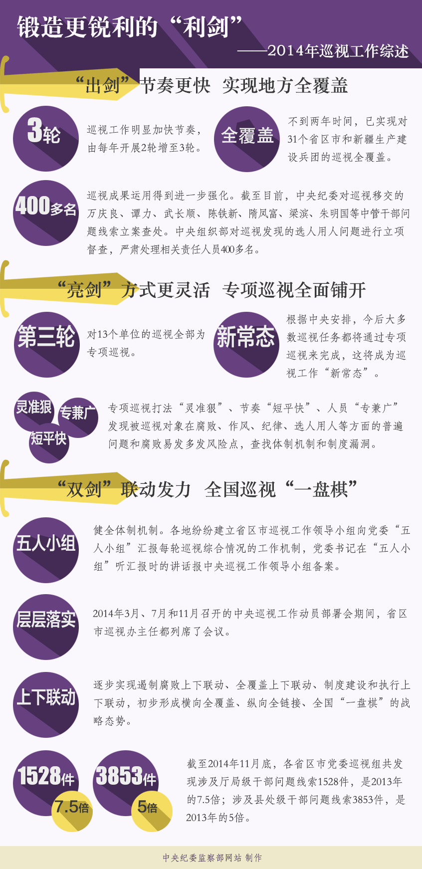 目前,巡视已逐步实现遏制腐败上下联动、全覆盖上下联动、制度建设和执行上下联动,初步形成横向全覆盖、纵向全链接、全国“一盘棋”的战略态势。统计显示,截至2014年11月底,各省区市党委巡视组共发现涉及厅局级干部问题线索1528件,是2013年的7.5倍;涉及县处级干部问题线索3853件,是2013年的5倍。